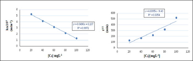 Dye concentration dependent degradation kinetic: The plots of In(Co/C) as a function of time (optimum catalyst load 250 mgL-1, and pH 10) using varying concentrations of MB, are shown in Figure 11. The observed linear plots of ln(Co/C) versus time, proves the applicability of pseudo first order kinetic model for dye degradation over its different studied intial concentrations. Values of MB photocatalytic degradation rate constant (k), and MB half-life time (t1/2) in solution, using varying initial concentration (C0) of MB, are given in Table 3. Plots of degradation rate constant (k), and MB half-life (t1/2), each as a function of MB intial concentration (C0), are shown in Figure 12A&12B, respectively. Whereas, the dye degradation rate decreases with increasing initial concentration (C0) of MB, the dye half-life time (t1/2) in solution has the reverse trend.