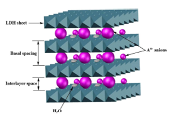 The structure of LDH can be represented by the general formula [M1-x2+Mx3+(OH)2]x+[Ax/n]n- mH2O where the cations can be M2+= Mg, Fe, Co, Cu, Zn…, M3+=Al, Mn, Fe, Ga and An- are mainly inorganic or organic anions such as CO32-, OH-, Cl-, NO3- and others (Figure 1).1–4 Their role is to compensate the positive charges of lamellae and guarantee the electro-neutrality of the entire network; water molecules can be also present. These structures derive from that of the mineral brucite, Mg(OH)2, in which Mg ions are located in octahedral sites with six OH- groups at the vertices, pointing the H atoms towards the interlayer spacing. The octahedra are linked by edges forming planar and neutral extended layers connected by H bonds. When the bivalent cations are partially substituted by trivalent ones, positively charged sheets form: to restore the electro-neutrality anionic species between the layers are mandatory. In these cases together with hydrogen bonds also electrostatic interactions take place, that regulates the resulting arrangement of the layers. The crystal structure deriving from the stacking of layers can be of rhombohedric or hexagonal symmetry: however most of the synthetic LDHs display rombohedral R-3 unit cell. An important request for the LDH stability is that the cations located in the octahedral sites should have similar ionic radii and in general the ratio M2+/M3+ is between 1 and 6. In principle, there is no limitations to the anionic species that can balance the positive residual charges. It has been observed that simple inorganic species with high charge/radius ratio enter more easily into the LDH layers, because they also improve the electrostatic interactions. For organic anions other factors such as their geometry, size and their mutual interaction are particularly important for the intercalation.