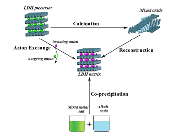 This interesting method takes advantage of the memory effect of some LDHs. In fact, these materials, when heated at temperatures of about 400-500°C in inert atmosphere, form a mixture of metal oxides that is able to regenerate the hydroxidic layers when exposed to water.1,4 The procedure contemplate that a LDH-CO3 sample (simple to produce) is thermally decomposed and the resulting mixture of oxides is dispersed into the desired anion solution under an inert atmosphere and by using de-carbonated water to avoid the CO32- contamination. This is the method of choice when large anions should be intercalated into LDH or when the chosen anions are not favored for intercalation by ion exchange method. It is also the preferred method for active principle intercalation, because the presence of anions, such as Cl- or NO3- , with possible negative effects into living bodies, is avoided. The incorporation of competing anions is also limited, even if particular care should be paid to the pH value that when raises too much can favor the OH- insertion. For this method, a variety of examples can be found in the literature from pesticides to vitamins and antibiotics.3
