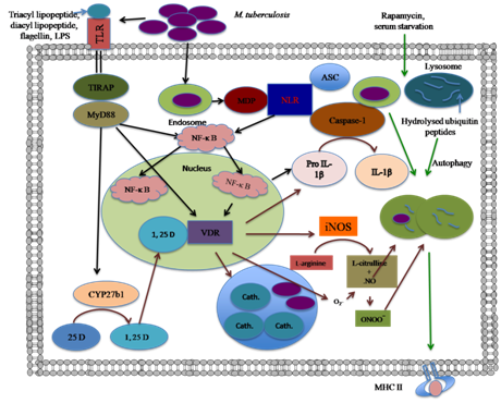 Vitamin D pathway: Vitamin D has been used to treat TB in the prebioticera. The role of vitamin D as an inducer of anti-microbial activity in human monocytes and MΦs has been reported.23 Vitamin D can be obtained from cod liver oil or synthesized in the skin during exposure to ultraviolet light. Vitamin D is readily metabolized in the liver to form 25 hydroxyvitamin D (25[OH]D), the accepted form of vitamin D. 1-α-hydroxylase enzyme Cyp27B1 converts 25[OH]D to a steroid hormone 1-α, 25-hydroxy vitamin D (1α,25[OH]2D), a biologically active metabolite. 1α, 25[OH]2D has been found to induce anti-mycobacterial activity in both monocytes and MΦs.23 1α, 25[OH]2D has been reported to bind the nuclear vitamin D receptor (Figure 1), which is already activated by signals from TLR, and enhances superoxide burst, phagolysosome fusion, induction of NOS and the activity of anti-microbial peptide (cathelicidin LL-37), which has been reported to exert anti-tubercular activity.24