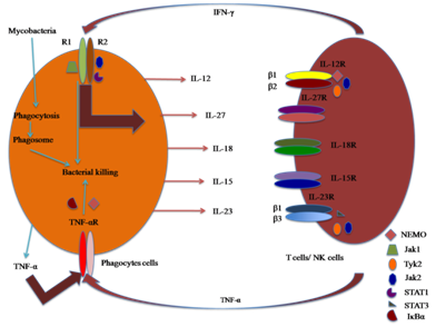 Cytokines: a link between innate and adaptive immunity: Cytokines are cell-secreted, low-molecular weight and highly potent glycoproteins through which cells communicate with each other. They are largely produced de novo upon stimulus (though a few of them are produced constitutively), and act as paracrine, endocrine and autocrine regulators at nano-molar or even at sub-nano molar concentrations. Cytokines may be classified as ILs (between leukocytes), lymphokines (produced by lymphocytes), monokines (produced by monocytes), chemokines (those responsible for chemotaxis) and growth factors (which stimulate proliferation, differentiation and the growth of specific cells) depending upon their main producer cell or function. Cytokines have major role(s) in homeostasis and inflammatory responses. Cytokines are vital component of immunity to TB, and play an important role(s) in innate and adaptive immune responses. Some of the important cytokines which function as a link between innate and adaptive immunity to TB are described below.