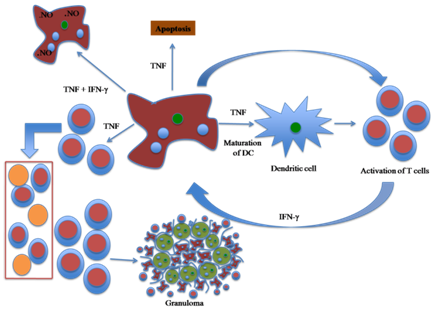 TNF-α: TNF-α (a prototype pro-inflammatory cytokine), a 51 kDa homodimer, is secreted by infected monocytes, MΦs, DCs (Figure 3), T-cells, NK cells, and mast cells. Two distinct receptors for TNF-α are encoded by separate genes. TNF-α contributes its major role in the regulation of apoptosis of M. tuberculosis-infected cells (Figure 3).49 Apoptosis, in turn, could contribute to protection either by direct killing of M. tuberculosis or by presenting the antigen by DCs. Maturation of DCs was promoted by TNF-α (Figure 3), thereby inducing migration and up-regulation of the molecular pattern required for activation of T-cells.50 TNF-α in association with IFN-γ has been reported to activate murine MΦs for the killing of intracellular M. tuberculosis via the induction of RNI (Figure 3),51 whereas TNF-α-deficient mice have been reported to produce insufficient amount of RNI, and thus fail to control the disease progression.52 In some in vitro experiments, TNF-α has been reported to support the growth of virulent mycobacteria, which create doubt about its role(s) in the induction of nitrogen radicals.53 TNF-α has a major role in granuloma formation, and also has some immune-regulatory properties.54 Increased susceptibility to mycobacterial infection was observed in TNF-α or TNFR-αKO mice.55 Another major function of TNF-α is to recruit T-lymphocytes and monocytes to the site of infection, and the movement of these cells occurs because of its action on vascular endothelium (Figure 3).56 TNF-αdecreased the expression of chemokine receptors (CCRs) such as CCRs and induced the production of regulated on activation normal T-cells expressed and “(RANTES)”.57 The role of TNF-α, therefore, is like a ‘double-edge sword’ because it not only helps in granuloma formation but also cause host-mediated destruction of lung tissue. The neutralization TNF-α results in increased risk of TB, increased production of IL-12 enhanced expression of chemokines and decreased IFN-γ production in blood. Patel et al.,58 have shown that HIV-infected individuals have impaired TNF-α-mediated MΦ apoptotic response to M. tuberculosis.58 No association between gene polymorphism of TNF-α and disease susceptibility due to M. tuberculosis infection has been established, yet.