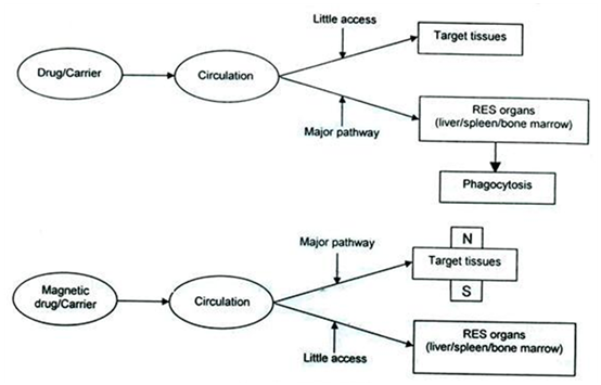 Drug targeting is a specific form of drug delivery where the drug is directed to its site action or absorption. This could be a particular cell, organ structure or tissues. The aim of the specific targeting is to enhance the efficiency of drug delivery and at the same time to reduce the toxicity & side effects. Magnetic drug transport technique is based on the assumption that the drug can be either encapsulated into a magnetic microsphere or conjugated on the surface of the microsphere. When the magnetic carrier is intravenously administered, then accumulation takes place within the area to which the magnetic field is applied (Figure 1) and often augmented by magnetic agglomeration. The accumulation of the carrier at the target site allows them to deliver the drug locally. Efficiency of accumulation of magnetic carrier on physiological carrier depends on physiological parameters e.g. particle size, surface characteristic, field strength, & blood flow rate etc. The magnetic field helps to extravasate the magnetic carrier into the targeted area. Very high concentration of chemotherapeutic agents can be achieved near the target site without any toxic effect to normal surrounding tissue or to whole body. It is possible to replace large amounts of drug targeted magnetically to localized disease site, reaching effective and up to several fold increased drug levels.4,5