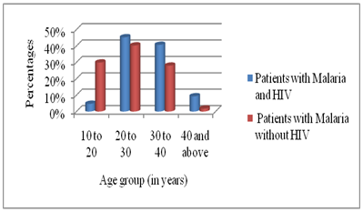 The average age was 39.29 years ±12.05 with ages ranging between 10 to 50 years. The age group of 20 to 30 years was the most represented; with 45% and 41% respectively for the patient’s group with malaria and HIV and the patient’s group with malaria without HIV (Figure 1). The percentage differences were statistically meaningful with a P value = 0.0002 (P <5%).