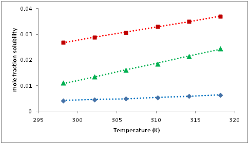 where N is the number of experimental points. All these evaluated values are given Table 3, Table 4 & Table 5. It is evident from these Tables that the results evaluated by modified Apelblat equation and λh equations are in good agreement with experimental solubility.