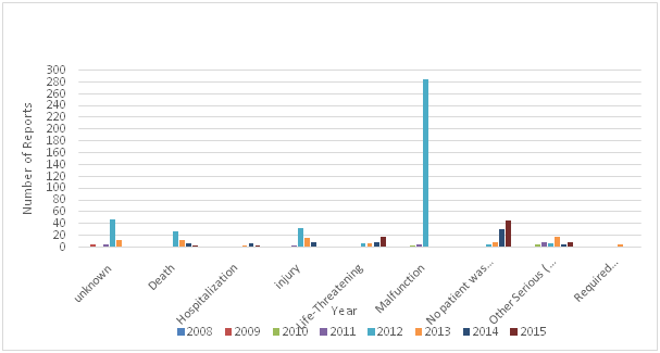 Adverse events of medical devices such as ‘arching’ and ‘burns’ from defibrillator pads must be reported to the regulatory authority in the country where the incident happens, unreported problems increase the potential for harm to patients and healthcare professionals. Reporting adverse events can help regulatory authorities taken preventive measure, investigate, work with manufacturers on corrective actions, and disseminate reports to other regulatory authorities and reporting centers such as the National Competent Authority Report (NCAR) of International Medical Device Regulators Forum (MDIRF), and the Asian Harmonization Working Party (AHWP) Safety Alerts Dissemination System (SADS).The number of adverse events submitted to the USFDA by manufacturers, user facilities, and other reporters doubled from 2003 to 2007, the overall medical device adverse event reports submitted in 2003 were 72,866 , increasing to 150,210 reports in 2007.14 The majority of these reports were submitted by manufacturers. The medical device recalls by manufacturers is very important as it could be used to take preventive measures to prevent the occurrence of incidents that may leads to injuries and deaths. The total number of recalls reported by the USFDA for the period 1999 – 2005 was 3771.15 The Therapeutic Good Administration (TGA) received a total of 32,300 medical device adverse events reports during the period 1986 to 2013, with 3309 of those received in 2013,16 and the majority of these reports were made by sponsors of medical devices. The Saudi FDA reported 705 adverse events during the period (2008 to 2015), the majority of these reports (83%).were reported by manufactures and vendors, and 12% were reported by healthcare providers. 7.5% of these reports were death, 9.2% were injuries, and 42% were malfunction. The total number of Adverse Events reported by the Saudi FDA during the period (2008 - 2015) by type of outcome of the adverse event is shown in Table 1 and Figure 5 and Figure 6.17