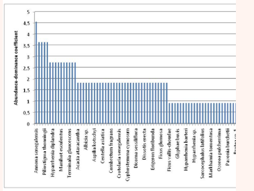 The Figure 4 shows that Sarcocephaluslatifoliuswhich belonged to a group of 57 plants with a recovery <5% corresponding to Braun- Blanquet scale 1 (Figure 5) was weakly represented in its Adamawa region’s savannahs.