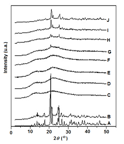 Figure 2 XRD curves of A) 3TC, B) physical mixture of 3TC/Kollidon, C) Kollidon, and Kollidon/3TC blends containing D) 5 wt%, E) 10 wt%, F) 15 wt%, G) 20 wt%, H) 30 wt%, I) 40 wt% and J) 50 wt% 3TC obtained in the mixer chamber at 130°C.