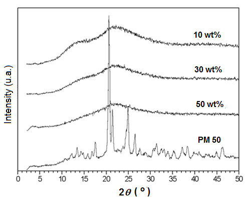 Blends of Kollidon/3TC processed in the mixer chamber produced a transparent pale-yellowish solid in most of the tested compositions. Figure 2 shows the X-ray diffraction (XRD) curves of 3TC, Kollidon VA 64, physical Kollidon/3TC mixture containing 50 wt% 3TC and their blends prepared in the melt mixer. Kollidon is an amorphous polymer characterized by a bimodal amorphous halo with maximum intensities at 2q=13 and 22°. In opposition, 3TC shows an XRD pattern with several crystalline reflections which is compatible with a highly crystalline form I with main reflections at 2q= 20.6, 21.4, 24.9 and 26.5°.16,17 As expected, the curve of the 50 wt% physical mixture is characteristic of a highly crystalline material since no melting of 3TC crystals may occur during the physical mixing process. Nevertheless, blends prepared by melt blending in the melt mixer are amorphous up to 20 wt% of 3TC, when reflections attributed to 3TC crystalline phase are seen. The amorphous profiles of XRD curves up to 20 wt% of 3TC suggested solubilization of the API or dispersion of 3TC amorphous domains in the amorphous Kollidon matrix up to concentration between 15 and 20 wt%.