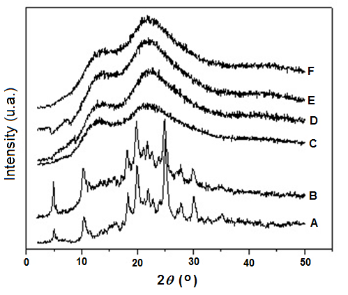 Figure 4 XRD curves of A) TDF, B) physical mixture of Kollidon/TDF 50 wt%, C) Kollidon, and Kollidon/TDF blends containing D) 5 wt%, E) 10 wt% and F) 15 wt% of TDF obtained in the mixer chamber at 10 rpm and 130°C.