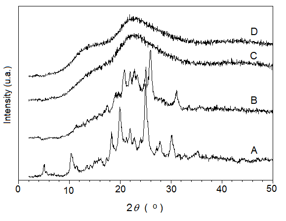 Figure 5 XRD curves of A) TDF, and blends of Kollidon/TDF containing B) 50 wt% C) 30 wt% and D) 10 wt% of TDF obtained by HME.