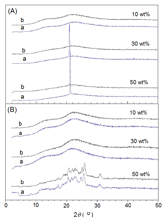 Figure 6 XRD curves of (A) Kollidon/3TC and (B) Kollidon/TDF blends containing 10, 30 and 50 wt% of the APIs obtained by HME (a) sample after 5 months (4 months for TDF) and (b) initial sample.
