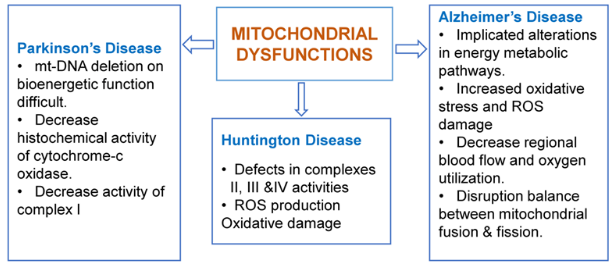 Impaired mitochondrial dynamics, oxidative stress and mutations in the mitochondrial DNA underlie the major downstream processes of mitochondrial dysfunction that lead to a vast spectrum of neurodegenerative diseases. Mitochondrial dysfunction results in depletion of ATP which ultimately affects the enzyme complexes involved in ETC. Targeting energy metabolism in mitochondria, free radical production or disease related protein interaction with mitochondria lead to the preservation of mitochondrial functioning which is emerging as one of the best approaches to treat neurodegenerative diseases. Thus, apart from looking neurodegenerative diseases on the whole, a detailed understanding of the functioning of mitochondria and their role in degeneration would pave new options for the therapy of age-related neurodegenerative diseases.