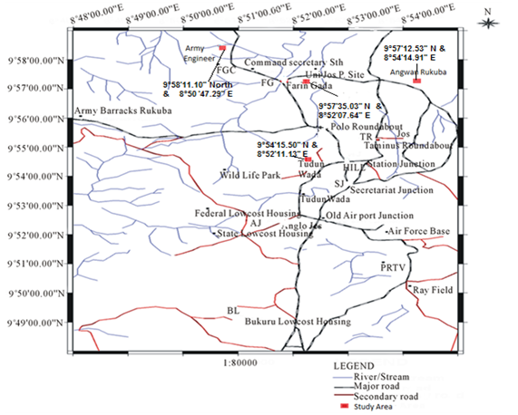 Jos North Local Government Area is the capital city of Plateau State and is located on latitude 9°56'21.7''North and longitude 8° 54'8'' East of Greenwich meridian (GM). Samples for analysis were collected from four different automobile garages situated in different locations of Jos North LGA indicated in Figure 1. The four locations are; Army Engineer, Angwan Rukuba, Farin Gada market and Tudun Wada. The exert spots where the samples were collected are indicated in red colour on the Map (Figure 1). All these automobile garages have hosted these activities for more than 15 years.