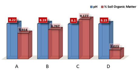 The results obtained for selected physicochemical properties of soil samples are summarized in Figure 2. The pH in the soil samples were in slightly alkaline condition and ranged from 8.10 to 8.20. The values were higher than those reported.15,16 This type of alkalinity is common in anaerobic soils as a result of oxygen deficiency in the soil caused by spilled engine oils.17 Heavy metals are mostly insoluble and hence unavailable at high pH.18 Soil alkalinity also increases the adsorption capacity of oxides, including manganese and iron hydroxides, which are strong natural adsorbents.19 Values for SOM ranged from 2.023% to 9.177% as seen in Table 1. SOM plays an important role in metal binding.20 From the results, site C has the highest SOM (9.177%) while site D had the least (2.023%). SOM immobilizes heavy metals at strongly acidic conditions by forming insoluble organo-metallic complexes and mobilizes metals at weakly acidic to alkaline conditions by forming soluble organic metal complexes.20 The distribution of pH, SOM among the garage sites showed a significant impact of anthropogenic pollution by spilled engine oil and other vehicular waste materials.