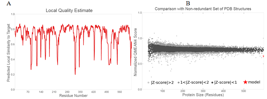 Figure 2 Structure validation of modelled ONCVO-GCL: (A) Local quality estimate of the residues of the predicted ONCVO-GCL model; (B) comparison of the predicted ONCVO-GCL structure with non redundant set of PDB structures.