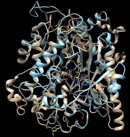 PyMOL molecular viewer was used to compute alignment and it gave a RMSD value of (3.728 Å) which indicates that the structures were slightly closely related (Figure 4). The ash colour helices represent the template structure, while the green helices represents the protein model. As shown by the alignment, the template structure (3IG5) chain A corresponded to the chain A of the protein model structure. More so, it was revealed by the molecular viewer that the Mg2+ binding to the amino acid residues of 3IG5 at GLU 96A, GLU 103A, GLU 52A and GLU 693A was also corresponding to the Mg2+ of the amino acid residues of the modelled template at GLU 106A, GLU 99A and GLU 52A. In 3IG5 template, there are GLU binding site which is not conserved and PGE sites which are not biologically relevant, which could not be found in the new modelled protein.