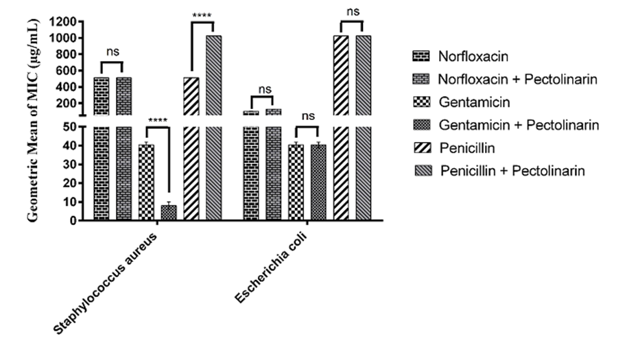 Figure 2 MIC of the antibiotics norfloxacine, gentamicin, and pencilillin the presence and absence of the pectolinarin in concentration MIC/8 (128µg/mL), towards S. aureus 358 and E. coli 27. Statisically significant values with *** p<0.0001- Non significant values (ns) with p>0.05.