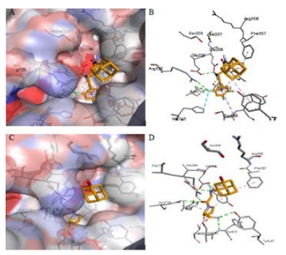The most intriguing question is why compound (9) did not show a significant increase in activity when compared to (4) if it is truly interacting with Arg358 via salt bridge rather than a hydrogen bond. Perhaps in order for this compound to enter the active site of the enzyme, the dehydration cost of the carboxylate is what decreases its binding affinity. This could explain in part the higher activity of its methyl ester. The methyl group could also be interacting with Phe357. The docking pose and the higher activity of compound (10) when compared to compound (9) suggests that extending the hydrophobic part of the ester could lead to even higher activity. Ethyl, propyl and t-butyl esters of compound (9) could be interesting potential compounds to be studied in the future to confirm this theory. The higher activity of compounds in this series that can interact with Arg358 as well as Glu205 and Glu206 demonstrates that polar interactions play a role in activity, however highly polar compounds could face a high cost of dehydration that potentially leads to lower activity.