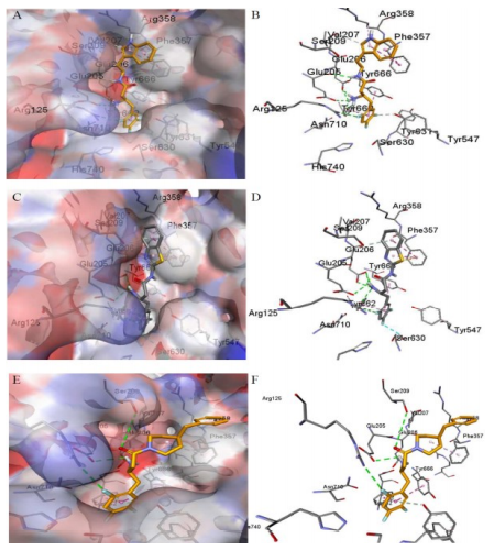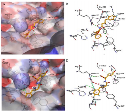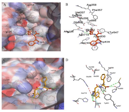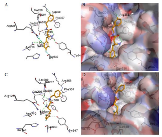 The next series of compounds is based on aromatic amino acids with bulky hydrophobic group to reinforce the hydrophobic interactions with the S2-pocket. The L-tryptophan derivative, Compound (11), has a larger indole ring than the L-phenylalanine derivative, Compound (12), which only possesses a phenyl ring. The L-tyrosine derivative was another derivative of interest because of the para-hydroxy group on the phenyl ring of the phenylalanine moiety which could potentially engage in ion dipole interactions with Arg358. The three compounds possess an α-carboxylic group which could potentially interact with Tyr547. On the other hand, compound (13), which is the methyl ester of (12), was chosen to probe the importance of the charge on the carboxylate. The docking studies showed that the indole ring of compound (11) did not successfully fit in to the S2-pocket, but rather outside the pocket interacting with Trp629 (Figure 7). The loss of activity could be attributed to the repulsion between the carboxylic acid group with Glu205 and Glu206. Compound (12) on the other hand displayed a binding pose in which the trifluorophenyl is embedded in the S1 pocket. While the phenyl group of the phenylalanine moiety can be seen interacting with the phenyl ring of Phe357 and the carboxylate group was was interacting withs the OH groups of Tyr547 and Tyr666 as expected, but the amino group is suffering repulsion with Arg125. Compound (14) showed a similar pose to (12) as expected, and although the additional hydroxy group was interacting with Arg358, but the proton on the phenolic group was remarkably close to those of Arg358 causing repulsion. Furthermore, the β-amino group showed repulsion with Arg125 Figure 8.