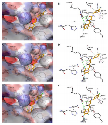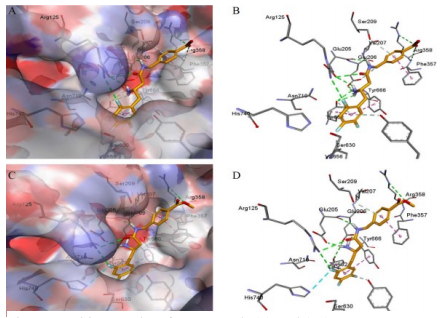 If the interaction with Arg358 was the most important variable for activity, we should expect higher activity with compounds (4), (8), (9) and (10). But this was not the case at all. In fact, while the para-trifluoromethyl group of compounds (8) was able to interact with Arg358, but this compound did not show any significant difference in its activity from compound (3), the parent unsubstituted compound. But on closer examination of the pose of compound (8), it is noticeable that the β-amino group lost its interaction with Glu205 and Glu206. The halogen-substituted compounds (5), (6) and (7) retained the salt bridge with Glu205 and Glu206, but were not able to interact with Arg358, and thus showed comparable activity to the parent unsubstituted compound. Compounds (4) and (9) and (10) on the other hand was able to retain both interactions, the salt bridge via their β-amino groups as well as the interaction with Arg358 via the para-substituents on the benzyl group. Those were the compounds that displayed the lowest IC50 in this series.