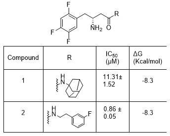 In the current study we were initially interested in designing molecules with more hydrophobic S2-pocket binding moieties to accommodate the mostly hydrophobic nature of the pocket. The design scheme is summarized in Figure 2. Our design started with questioning the effect of making a hybrid molecule between sitagliptin and vildagliptin, compound (1). In this compound, we were interested in retaining the (R)-3-amino-4-(2,4,5-trifluorophenyl)butanoyl moiety which was optimal for binding to the S1-pocket and replacing the triazolopiperazine with the adamantyl moiety of vildagliptin. We were interested in seeing whether this molecule will fit in to the active site in the same manner that vildagliptin does. Upon examining the docking results of compound (1) (Figure 3), the docking pose of compound (1) revealed that the adamantyl moiety emerges out of the S2-pocket to interact with Tyr547 in the S1-pocket. On the contrary, vildagliptin crystal structure (PDB:6b1e) Table 1 reveals that the adamantyl moiety embedded in the pocket with the hydroxy group on the ring interacting with Ser209 via hydrogen bonding. One possible explanation for the out-of-pocket pose of compound (1) could be the loss of the potential of hydrogen bonding with Ser209. The biochemical assay results (Table 2) showed a dramatic loss of the activity (IC50=11.31±1.52 µM) which could be reflected by loss of all potential interactions with the S2-pocket. This finding suggested that it is important to examine the docking pose of the proposed compounds and to rationalize their activity based on the interactions with the active site residues.