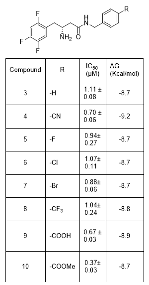 To test the activity of the new inhibitors, we used the same biochemical assay as described by Kato et al.10,11 The assay was validated by running Michaelis-Menten Kinetics and comparing the Km of the substrate with that of the literature. The assay used is a kinetic fluorometric assay that relies on the fluorogenic substrate Gly-Pro-4-methylcoumarinamide which gets cleaved by DPP-4 enzyme releasing the fluorescent molecule 7-amino-4-methylcoumarin from the C-terminus of the peptide. Human DPP-4 was purchased from sigma (Catalog # D3446-10UG) and 100 mL of the 800 pM stock solution was prepared in 10 mM Tris buffer at pH-8 containing 200 mM NaCl, 1mM EDTA and 10% glycerol. The enzyme was stored at -70 °C as recommended by the manufacturer. Before performing the biological assay, the enzyme is diluted 4-fold using 100 mM HEPES buffer with pH 7.8 and 100 µg/mL BSA to make an initial enzyme concentration of 200 pM. The substrate was purchased from Sigma Aldrich (Catalog# G2761-25MG) and a 16 mM stock solution was prepared by adding 3.81 mL of HEPES buffer to the 25 mg of the peptide. Each well except for the blank contains 25 µL of the enzyme, 25 µL of the substrate, and 50 µL of the test compounds bringing the final enzyme concentration in each well to 50 pM. The test compounds are prepared by serial dilution to be 20X the final concentration in each well using DMSO as a solvent. Each concentration is then diluted 10 times in HEPES buffer to form 2X the final concentration of the enzymatic reaction before they are finally dispensed in each well. The substrate concentrations are prepared by diluting the stock solution in HEPES buffer. The blank reactions are prepared by adding 50 µL of the highest concentration of the inhibitor in HEPES buffer to 25 µL of HEPES buffer. The control reaction on the other hand is prepared by adding 50 µL of 10% DMSO in HEPES buffer to 25 µL of the enzyme. The test compound reactions are prepared by adding 50 µL of the 2X solutions of the test compound in HEPES buffer to 25 µL of the enzyme. After 10 min incubation time, 25 µL of the peptide substrate is added to each of these groups to complete the final volumes to 100 µL. The fluorescence of the plate is recorded at λex of 360 nm and λem of 460 nm. The fluorescence readings are taken every 30 seconds for 10 min at 37 °C, and the initial velocity of each reaction is calculated from the slopes as RFU/min.