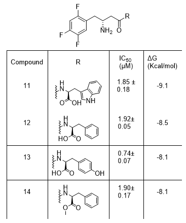 On the other hand, compound (13) showed a flipped docking pose with the trifluorophenyl moiety in the S2 pocket interacting with Phe357, the carbonyl group was interacting with Tyr547 and the β-amino group with Glu206. The phenyl moiety of phenylalanine was embedded in the S1 pocket and the methyl ester was at the entrance of the S1-pocket. This was the only compound in this series that retained the salt bridge with Glu206. In the enzymatic assay, compound (13) showed 2-fold increase in activity compared to other compounds in this series (Table 1). The lower activity of other compounds with carboxylic acid functionality is presumably due to the repulsion forces either between the carboxylic acid functionality of those compounds with Glu205 and Glu206, or the β-amino group with Arg125 Table 4. The next series of compounds were chosen to possess bulkier hydrophobic ring systems but with no carboxylic groups to avoid any repulsions with Glu205 and Glu206. The ring systems in which we were interested contain nitrogen atom in hopes of interacting with Ser209 in the S2 -pocket.