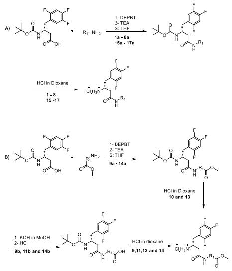 Dipeptidyl peptidase-IV enzyme is a relatively new target for type 2 diabetes. Inhibition of DPP-4 results in the prolongation of the 2 minutes half-life of Glucagon-like peptide-1 (GLP-1), an insulinotropic peptide which is released by the L-cells of the intestine in response to food ingestion.1–3 Interestingly; the insulinotropic effect of GLP-1is glucose-dependent. This means that the insulinotropic effect of GLP-1 in normoglycemic patients would not lead to hypoglycemia as seen with other classes of antidiabetics.4,5 Sitagliptin is the first FDA approved inhibitor of this enzyme to be introduced to the market for clinical use.6 Other inhibitors followed sitagliptin to the market in USA and Europe (Figure 1). Sitagliptin is a triazolopiperazine derivative of a β-homophenylalanine series that was discovered by Merck. It is a potent inhibitor of DPP-4 with an IC50 value of 18 nM.6 The crystal structure of DPP-4 with sitagliptin (PDB: 1x70) revealed that the trifluorophenyl moiety of sitagliptin was shown to occupy the S1-pocket while the triazolopiperazine moiety fits into S2-pocket interacting with Phe357. During the development of sitagliptin, the primary focus was directed towards finding the best S1-pocket binding group. Their results indicated that only small substituents on the phenyl ring were tolerated, and that the fluorine substituted ring showed superior activity. The trisubstituted analogs at positions 2,4 and 5, showed the highest activity of all compounds.6,7 In this study, we will be retaining the S1-pocket moiety while substituting the trifluoropiperazine with other substituents with different hydrophobic properties, using the molecular docking as a guide.