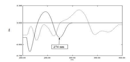 Different aliquots of SOF and LDV equivalent to 5-50µg/mL, respectively, are separately transferred from their respective working standard solutions (100µg/mL) into two separate series of 100mL volumetric flasks and volume is completed to the mark with methanol and mixed well. Zero order absorption spectra of SOF and LDV are scanned in the range 200-400nm (Figure 2) and stored. The calibration curves relating the obtained absorbances to the corresponding concentrations are constructed and the regression equations are calculated. Calibration curves are constructed relating the first derivative of the absorbance of SOF at 274nm, versus the corresponding concentrations. The regression equations are computed.