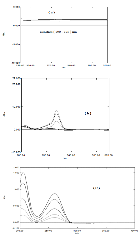 Ratio subtracting method: Ratio subtracting method (RSM) plays an important role in solving the overlapping spectra of two drugs. The stored spectra of binary mixtures of SOF and LDV are divided by the absorption spectrum of 25μg/mL LDV as a dvisor then subtract constant value at the plateau region 290–375nm, therefore the zero-order absorption spectrum of SOF is obtained at 261nm by multiplying the obtained curve after subtraction by 25µg/mL of LDV as a divisor. Calibration curves relating the absorbance of zero order spectra of SOF at 261nm versus their corresponding concentrations are constructed and the regression equations are computed.