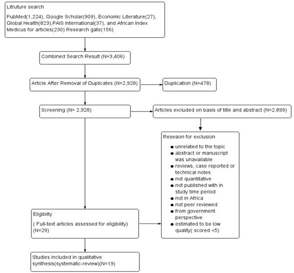 Studies were excluded based on their titles and abstract if considered not relevant to the topic. It is considered as not relevant if the title/abstract does not contain keywords, beyond the current review objective and if it is a unrelated title. Studies were also excluded after a full-text review which was estimated to be low quality. Studies not in Africa and not published in English were also excluded from this review. Because We were interested in quantitative studies only, we had excluded technical notes, case reports, and literature reviews. Focus groups, stakeholder analyses. Studies with no clear aims or objectives, no statistical analysis, or that were not peer-reviewed were also excluded. Studies also excluded for this review, those assed the out of payment, affordability, or availability status of essential medicine from the government payer perspective.