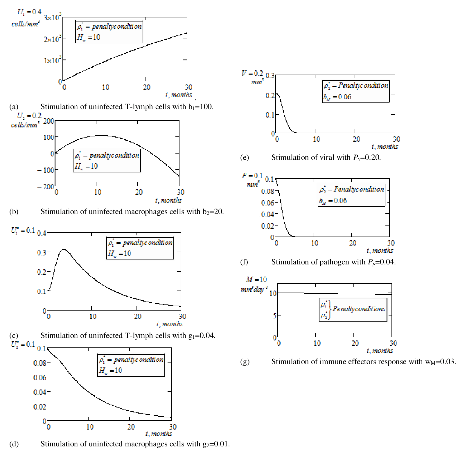 , i=1, 2 as infected T–lymphocytes and macrophages cells, V – viral load, P – pathogen and M – immune effectors. Therefore, using classical ODEs, the simulative interactions of the above biological structure, is the formulation of a 7–Dimensional dynamic optimal control problem having its physiological derivation as follows: