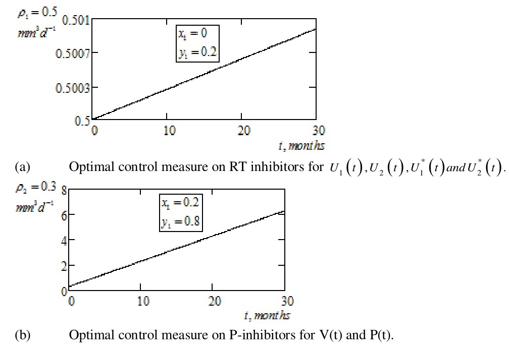 Now, we have seen that the results of the numerical simulations for continuous application of multiple chemotherapies without optimal control measures on treatment factors for a dual HIV–parasitoid pathogen as significantly beneficial to the maximization of both healthy T–lymphocytes and macrophages cells; and boosted immune effectors response, suppresses/reduced viral load and pathogens. The constraints of this result are the inability of the initial state system (1)–(7) to define treatment cost at this level. On this note, we opt to investigate the case for continuous multiple chemotherapy treatment (MCT) with control measures (bounds) on the optimal weight factors of