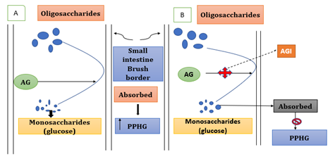 Figure 2 Mechanism of action of miglitol. In part A, the oligosaccharides in the present of α-glucosidase enzyme converted into monosaccharides and increased postprandial glucose level. Part B indicate that α-glucosidase inhibitors inhibit the enzyme and not allowed to conversion of oligosaccharides into monosaccharides and reduced postprandial hyperglycaemia.