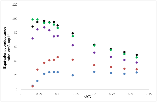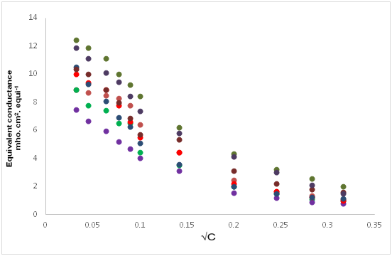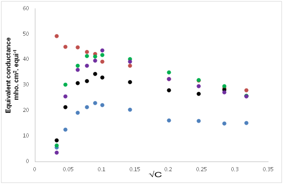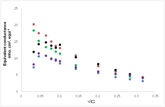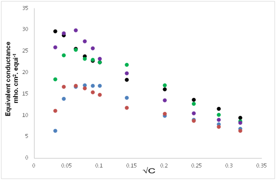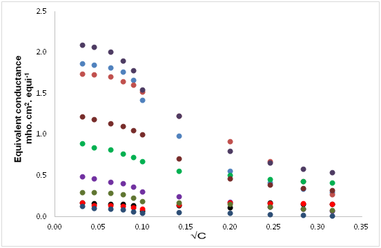 where θ is the cell constant (0.96cm-1) and c is the concentration (g.equi./lit.) of solution.