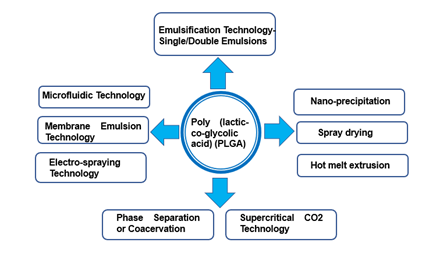 There are several methods to prepare the PLGA nano/microspheres. There are some tradition methods and others are more new technologies based. Those methods are illustrated in Figure 2 and their details of preparations are summarized below. Ruirui et al. describe some of these methods used for delivery of a number of drugs encapsulated in PLGA micros/nano-spheres.23