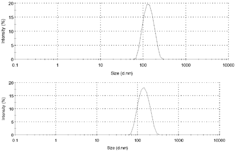 Method for preparation of carvedilol encapsulated PLGA nanoparticles involves dissolving the drug and polymer (1:10) in methylene chloride by thorough mixing as an oil phase. An aqueous solution containing 2% polyvinyl alcohol (PVA) with MW 9,000-10,000 D was used as a surfactant. API/polymer oil phase was added slowly in PVA aqueous solution dropwise and mixed thoroughly, keeping the oil/water phase ratio 1:7. The entire solution was mixed thoroughly in ice cold water to emulsify by sonication (Fisher Scientific Sonic Dismembrator Model 500) to achieve the desired particle size (Malvern Nano-ZS zeta sizer). The resulting nanoparticles were poured and mixed in 2% PVA aqueous solution for 3 hours, and collected following the centrifugation for 30 min at 14,000xg. The drug/PLGA nanoparticles were collected by discarding the supernatant, washed repeatedly with water. The resulting pure concentrated drug/PLGA nanoparticle suspension once again was passed through filter (Amicon® Ultra Centrifugal filter with MW 50 kD cut off), and centrifuged again for 10 min at 14,000xg to remove any free drug. It was lyophilized with sucrose (10-30%) as cryo-protectant or used freshly or stored at 4 oC for weeks, and drug loading was determined by HPLC. Figure 3 show the PSD of PLGA (A) and PLA (B).