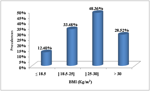 The average of BMI among HIV-infected patients with the metabolic syndrome was 28.32±5.7Kg/m2. The prevalence of these metabolic syndrome cases was higher in the BMI ranged from 26 to 30Kg/m2 with 48.36% (Figure 5). Our results corroborate with those found in studies made by Eholié, Biron and Jerico.10,17,18 The hypertrophy of the adipose tissue or the accumulation of fat in particular visceral being a key element in the definition of the metabolic syndrome, according to the criteria of the NCEP-ATP III could still explain our results.