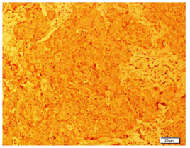 Figure 1 Photomicrograph showing immunohistochemical localization of chromogranin a in breast tissue. It is noted that tumor cells were positive with the chromogranin a marker.