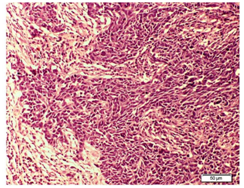 In the Histopathological examination of breast NETs resembles with lung and gastrointestinal NETs.2 According to the WHO, there are three histologic categories of breast NETs (solid carcinoid-like, large cell-type, and small cell-type).10 The growth of cells should be in solid sheets or insular pattern, presence of stippled chromatin and low grade cytological features.13 A histopathological examination of our patient made us consider the presence of neuroendocrine differentiation because the sections of breast nodule shows infiltrating tumor arranged in sheets and nests of atypical cells separated by fibrous bands and round to oval vesicular nuclei with powdery chromatin was seen. Further, the cytoplasm was scanty and frequent mitotic figures were present (Figure 6).