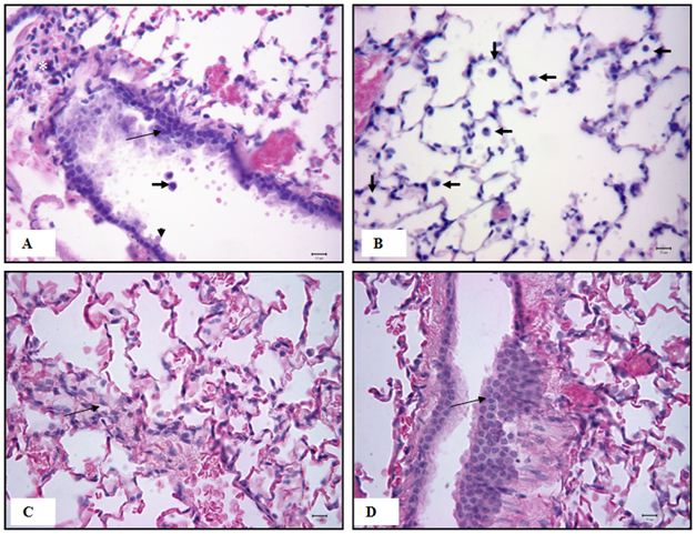 Figure 1(A-D) Light micrographs of SWCNTs-treated hamster lungs. (A) Lungs of animals treated with 2 mg/m3 SWCNTs for 4 days, had increases in macrophages laden with carbon particles in the airways (thick arrows), hyperplasia and hypertrophy of the airway epithelial cells (thin arrows) and blebbing of airways (arrowheads) and thickening of the alveolar interstitium (asterisk). (B) 2mg/m3 SWCNTs treatment for 4 days, treated tissues demonstrate increase in macrophages in the airspaces (thick arrows). (C) 2mg/m3 SWCNTs treatment for 8 days; treatment caused thickening of the alveolar septa and hyperplasia of the parenchymal cells (thin arrows). (D)2mg/m3 SWCNTs treatment for 14 days; caused epithelial cell hyperplasia of the airway (thin arrows) (Original magnification X400).