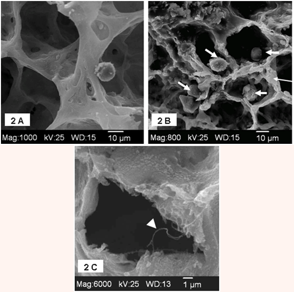Figure 2(A-C) Scanning electron micrographs of 14 day control and SWCNTs treated hamster lungs. (A) Control lung 14 day: normal alveolar structure and presence of few macrophages in the airspaces. (B) 14 days SWCNTs treated lungs: treated tissues demonstrate thickening of the alveolar septa (thin arrow) and increase in the number of macrophages in the airspaces (thick arrows). (C) 14 days SWCNTs treated lungs: treated tissues have deposits of SWCNTs along the alveolar walls (arrowheads).