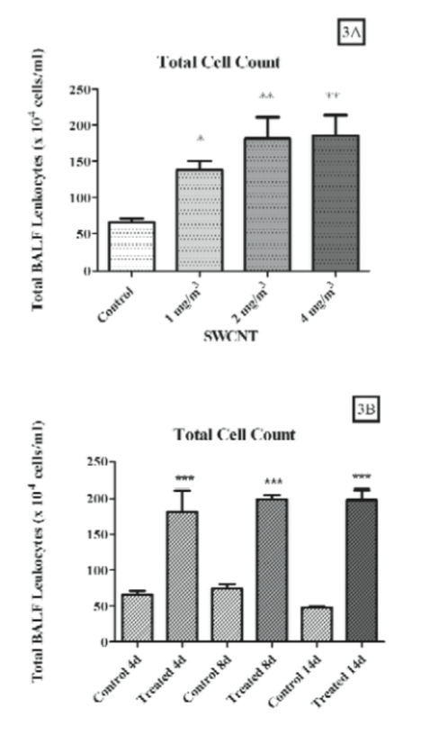 Figure 3(A-B) (A) This is a histogram that represents total BALF leukocyte counts of hamsters exposed to 1, 2 and 4mg/m3 of SWCNTs. *= p < 0.05 as compared to control, **= p < 0.001 as compared to control. Data indicated an increase in the total number of cells with increasing concentrations of SWCNTs. (B) This histogram represents total BALF leukocyte counts of hamsters exposed to 2 mg/m3 SWCNTs for up to 14 days. ***= p < 0.0001 as compared to control.