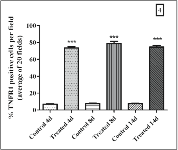 Figure 4 This is a histogram that represents TNFR1 cell counts from BAL cytospins of 4, 8 and 14 day controls and SWCNTs-treated hamsters. The treated groups were exposed to 2mg/m3 of SWCNTs for 4, 8 or 14 days. Percentage of TNFR1 positive cells was obtained by counting positive cell and total cells present in twenty random fields. ***= p < 0.0001 as compared to control.