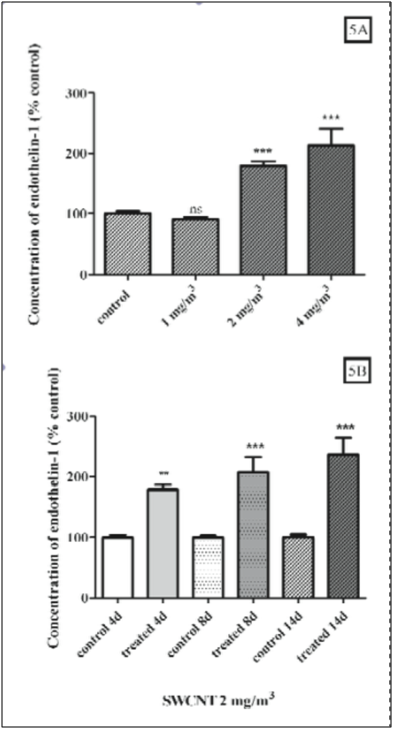 Figure 5(A-B) Lung ET-1 levels are presented in this histogram of control and SWCNTs-treated hamsters. (A) The treated groups were exposed to 1, 2 and 4mg/m3 of SWCNTs (2hrs/day for 4 days). The animals were euthanized 1 days post-exposure (p.e.) (B) The treated groups were exposed to 2 mg/m3 of SWCNTs for 4, 8 or 14 days. **= p < 0.001 as compared to control, ***= p < 0.0001 as compared to control.