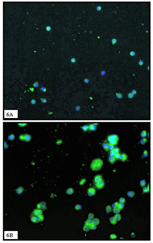 Figure 6(A-B) Fluorescence photomicrographs of control and SWCNTs-treated BAL cells representing Immunofluorescence Assay for ETA receptor. The treated groups were exposed to 2mg/m3 of SWCNTs for 8 days. (A) BAL cells obtained from control animals had low levels of ETA receptor (arrows). (B) BAL cells from animals treated for 8 days had increased levels of ETA receptor (arrows). DAPI was used as nuclear stain and appears blue, secondary antibody is FITC labeled and appears green (Original magnification X200).