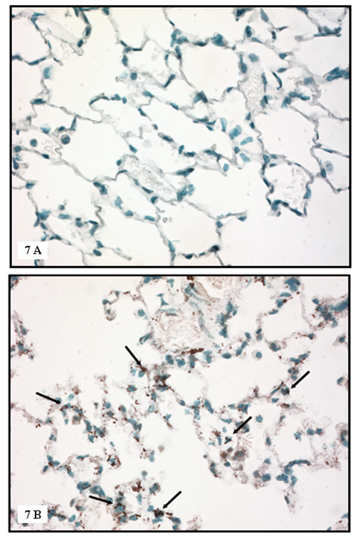 Paraffin embedded tissue sections were used for TUNEL assay (Figures 7A & 7B). The control animals lacked TUNEL positive cells (Figure 7A), while, animals exposed to SWCNTs for 8 days had an increase in TUNEL positive cells (Figure7B). Such increases indicate that SWCNTs treatment induced apoptosis of alveolar parenchyma and macrophages as compared to the control groups (Figure 7B). Similar results were obtained for 4 day and 14 day treated animals (photos not shown).