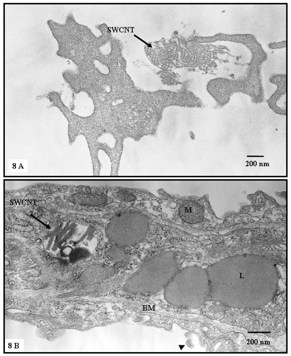 Figure 8(A-B) Transmission electron micrograph of SWCNTs treated hamster lung. (A) Electron micrograph of lung tissue from animals exposed to 2mg/m3 of SWCNTs for 8 days. Note presence of aggregates/ bundles of SWCNTs assembled in a mesh-like structure in the air spaces and cell processes that may be engulfing SWCNTs (black arrows). (B) Hamster lungs exposed to 2mg/m3 of SWCNTs for 14 days. Note deposition of bundles/ aggregates of SWCNTs arranged as parallel rods in the alveolar interstitial cell (thick arrow). Thickening of the basement membrane (BM) and presence of lipid deposits were observed and surfaces appear ruffled and irregular in the treated group (black arrowheads).