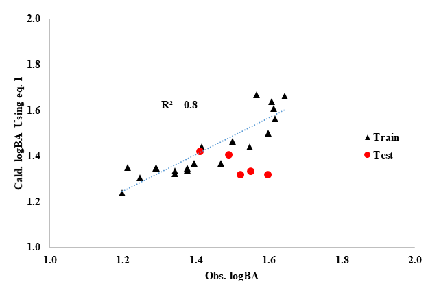 The observed and predicted logBA values were calculated using model eq.1 are recorded in Table 1. A graph is drawn between the predicted and observed activities for both the training and test sets using models eq. 1 are recorded in Figure 1. The figure shows that the models have a good predictive ability. Figure 1 shows that almost all the points, except a few, lie near the straight line. Thus, using eq,1. From the above statistical values, it is clear that the two-variable model is the best suitable model for predicting the activity of the current set of compounds.